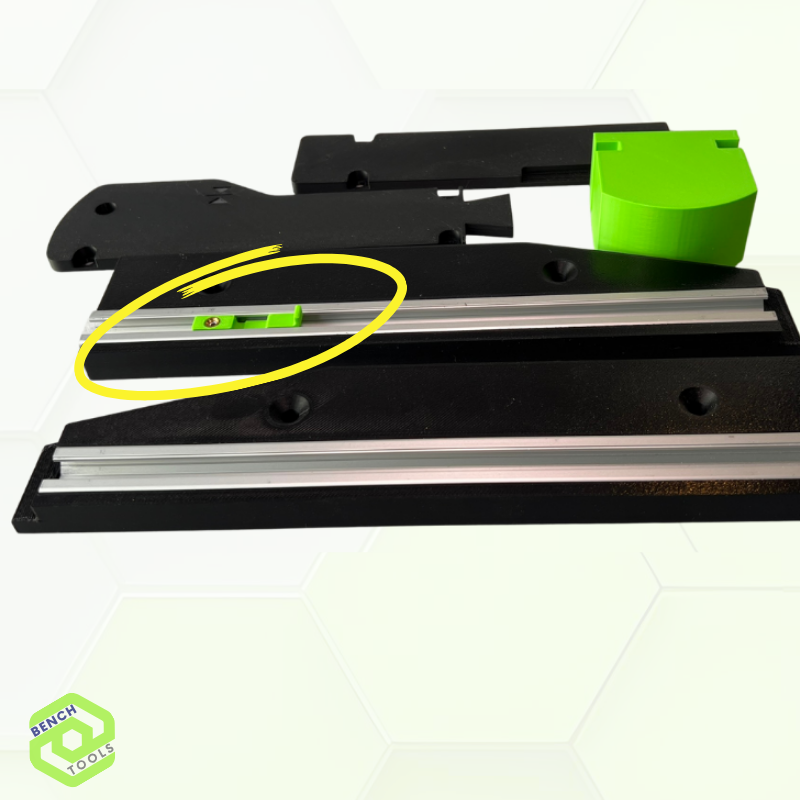 De aanslag is verend en verdwijnt dan in de rail en u kunt het materiaal nu afzagen op de gewenste lengte.